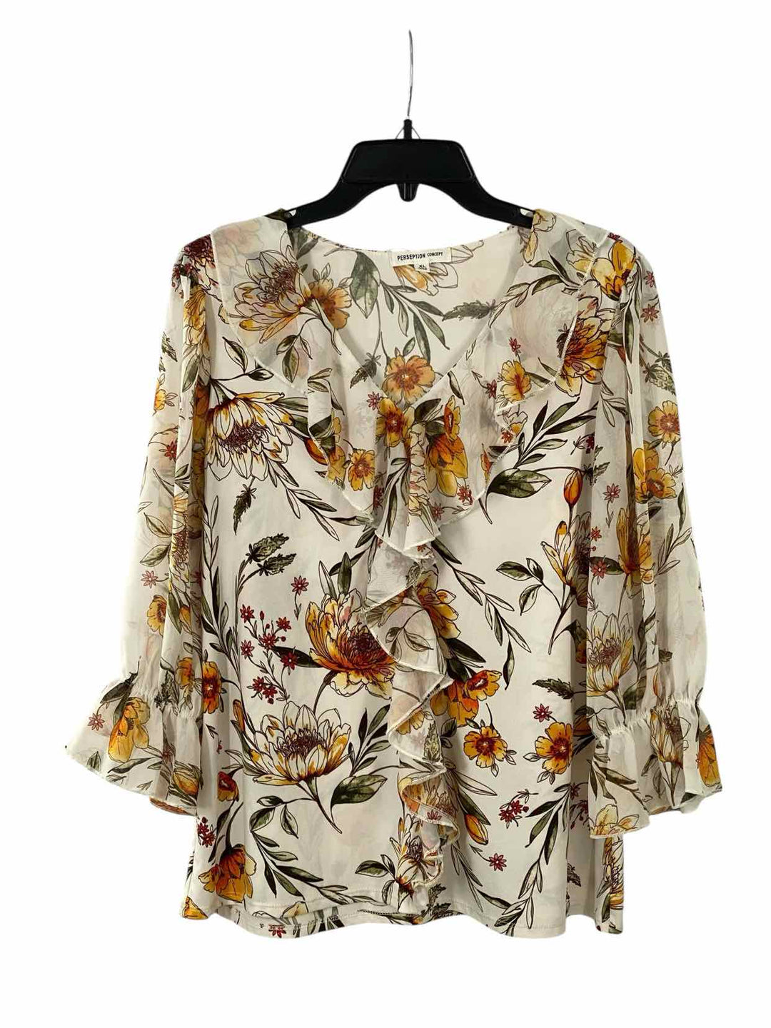 PerSeption Size XL White Green & Yellow Floral Long Sleeve Shirts